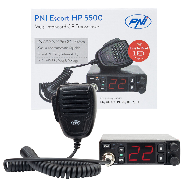 Stație Radio CB PNI Escort HP 5500, 12V/24V, 4W, Multi-Bandă AM/FM, ASQ pe 5 Niveluri și RF Gain, Ultra Compactă - 115x115x35 mm Stația radio CB PNI Escort HP 5500 este proiectată pentru a oferi o comunicare clară și eficientă, fiind remarcabilă prin dimensiunile sale ultra compacte (doar 115 x 115 x 35 mm), care permit instalarea în cele mai mici spații din bordul mașinii. Această stație multi-bandă (EU, CE, UK, PL, dE etc.) și multi-standard se alimentează la 12V sau 24V, fiind o soluție versatilă pentru autoturisme și camioane. Funcțiile avansate de filtrare a zgomotului, precum ASQ (5 niveluri) și RF Gain (7 niveluri), asigură o recepție fidelă și un sunet puternic, necesare pentru un trafic lin.