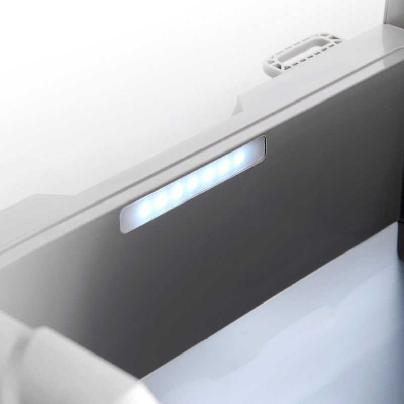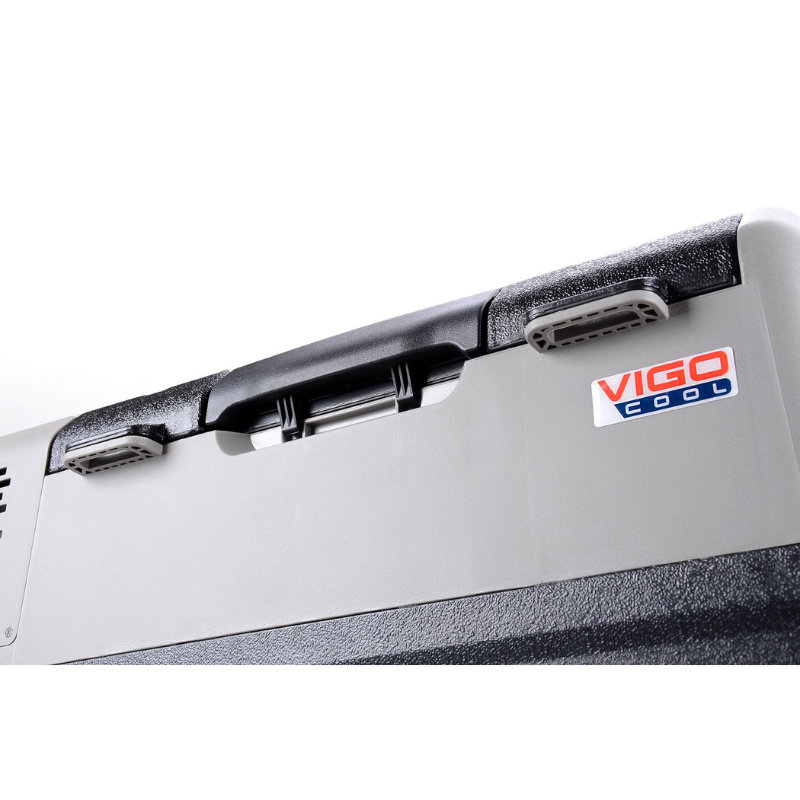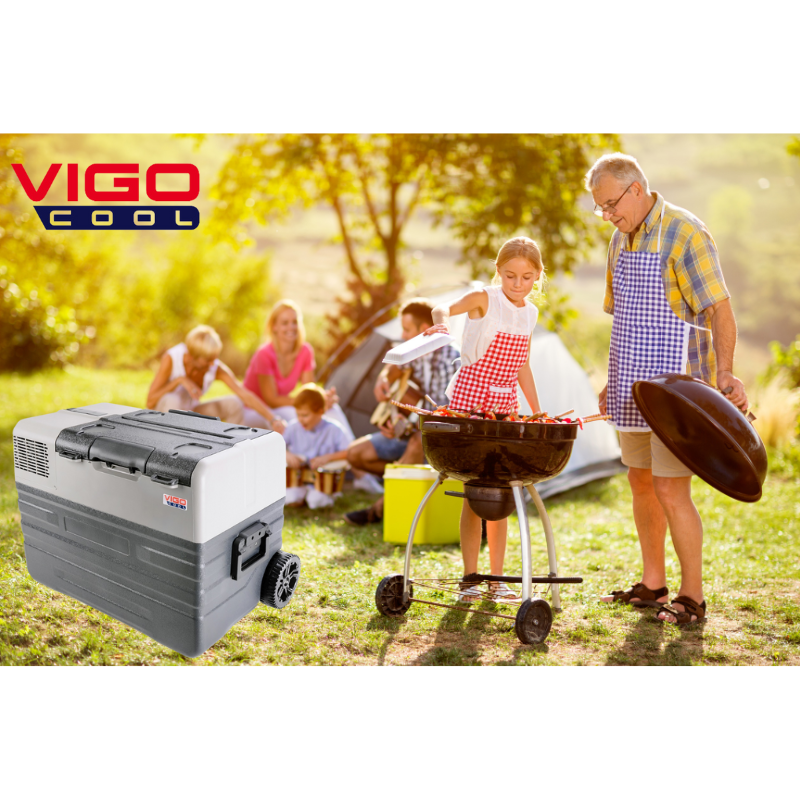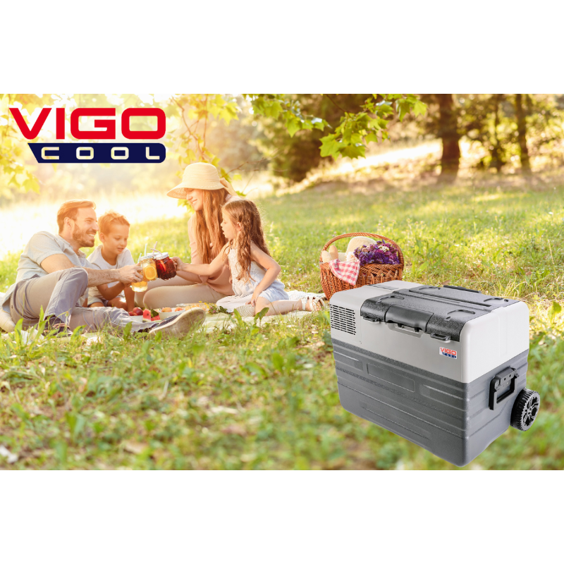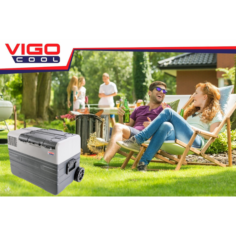 Frigider-congelator portabil cu compresor VIGO COOL V42W. Perfect pentru călătorii, călătorii sau pentru a lucra ca șofer. Eficiența ridicată de răcire păstrează alimentele și băuturile proaspete pentru mai mult timp, indiferent de condițiile meteorologice de afară.