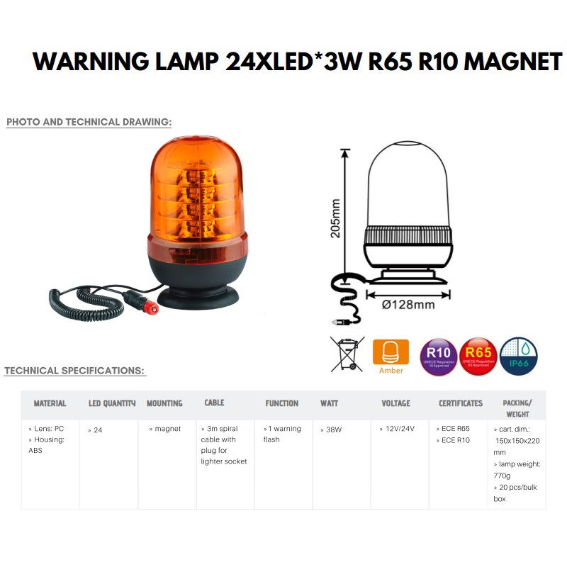 Specificații Girofar inalt cu lumină portocalie, LED, bază magnetică, 128 x 205mm, 12/24V: