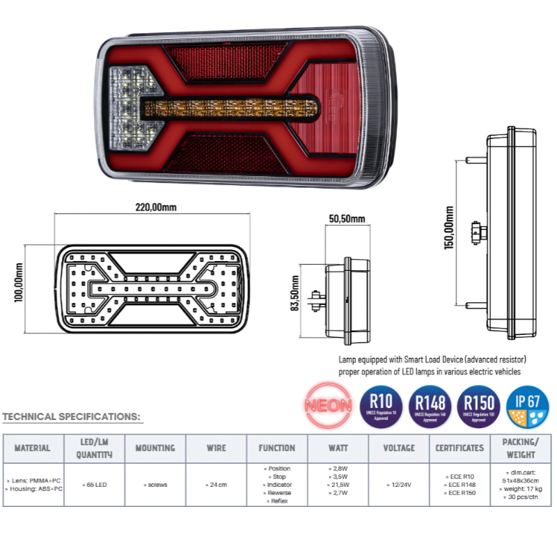 Triplă LED Spate X-SPIDER, Efect Neon - Vizibilitate Maximă, Siguranță Sporită Asigură-ți vizibilitatea pe șosea în orice condiții cu Tripla LED Spate X-SPIDER. Proiectată pentru a oferi performanță și fiabilitate, această lampă spate LED este un element esențial pentru siguranța ta și a celorlalți participanți la trafic, fie că ești la volanul unui autovehicul, camion sau remorcă. Chiar și în condiții meteo dificile, lumina puternică emisă de cele 69 de LED-uri de înaltă performanță te face vizibil de la distanță. La proiectarea lampii multifunctionale spate, s-a acordat o atenție deosebită funcționalității extinse, punându-ți la dispoziție multiple funcții într-un singur dispozitiv: poziție, frână (stop), reflector, semnalizare, lumină de ceață și lumină de marșarier. Modelul X-SPIDER respectă standardele Uniunii Europene și deține toate aprobările necesare (ECE R10, ECE R148, ECE R150), certificând calitatea superioară și destinația sa profesională. Echipată cu un dispozitiv Smart Load (rezistor avansat), lampa funcționează corect cu diverse sisteme electrice ale vehiculelor.
