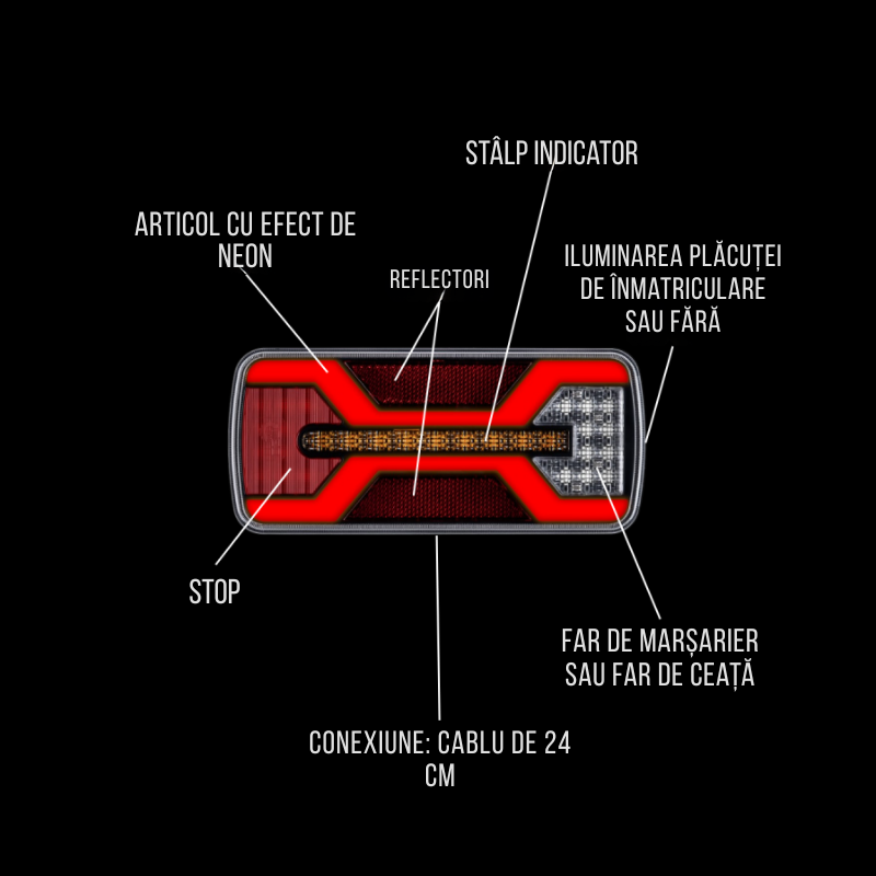 Versatilitate Maximă: Posibilitatea montării atât vertical, cât și orizontal, alături de funcțiile multiple (poziție, stop, semnalizare, ceață, marșarier, reflector) fac această lampă spate LED adaptabilă la o gamă largă de vehicule și nevoi de montaj, oferind flexibilitate sporită.