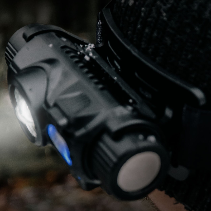 Fixează lanterna pe cap sau pe cască folosind banda reglabilă, selectează modul de iluminare dorit din butonul lateral sau activează senzorul de mișcare pentru control fără atingere.