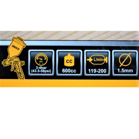 • Pistol de vopsit: Presiune lucru 3-4 bar, duză 1.5mm, capacitate rezervor 600cc, consum aer 119-200 l/min.