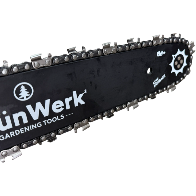 Montaj: Instalați lama și lanțul, asigurându-vă că tensiunea lanțului este corectă (lanțul trebuie să se poată ridica ușor, dar să revină ferm pe lamă).