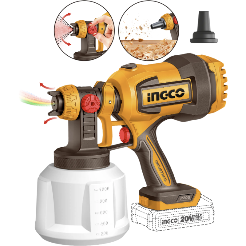 Libertate de mișcare: Fiind un model cu acumulator (Baterie 20V INGCO - se vinde separat), elimină cablurile, permițând vopsirea ușoară în spații exterioare sau greu accesibile, fără a depinde de o priză.