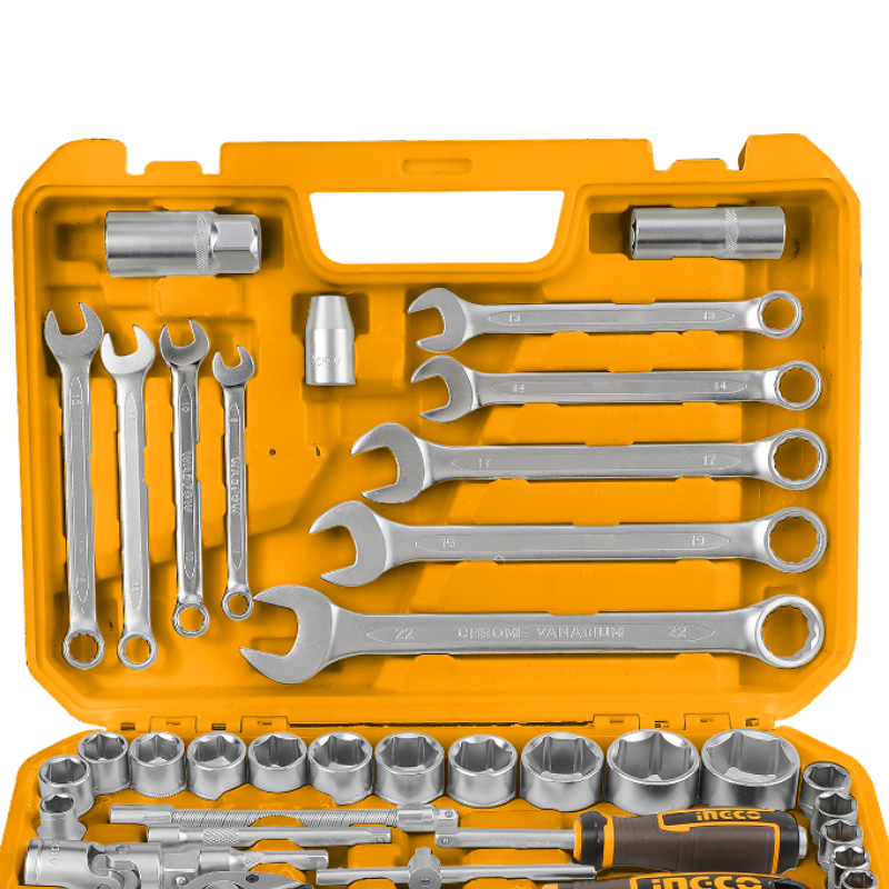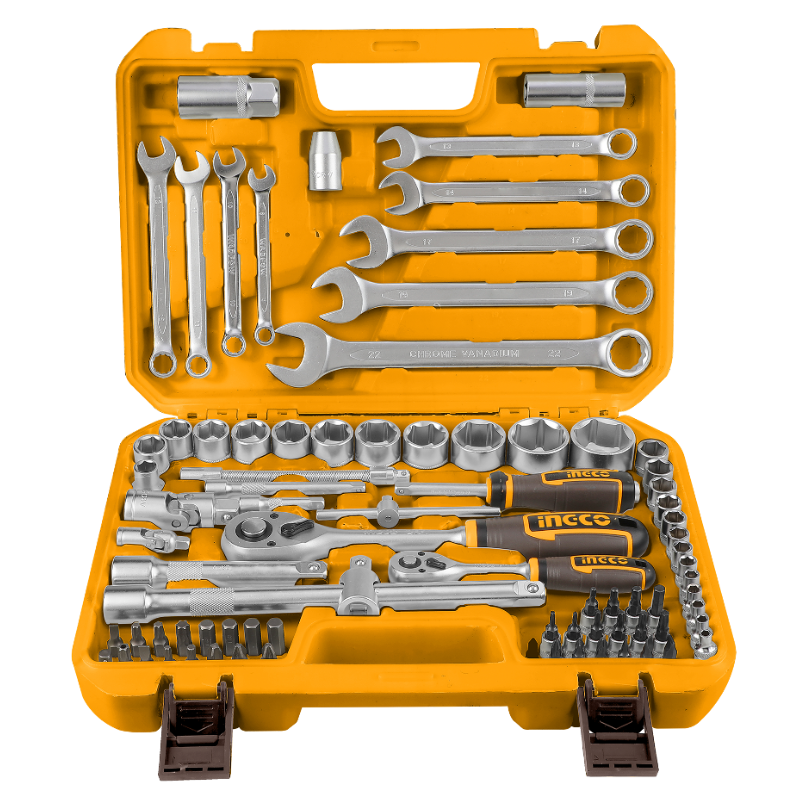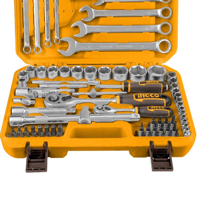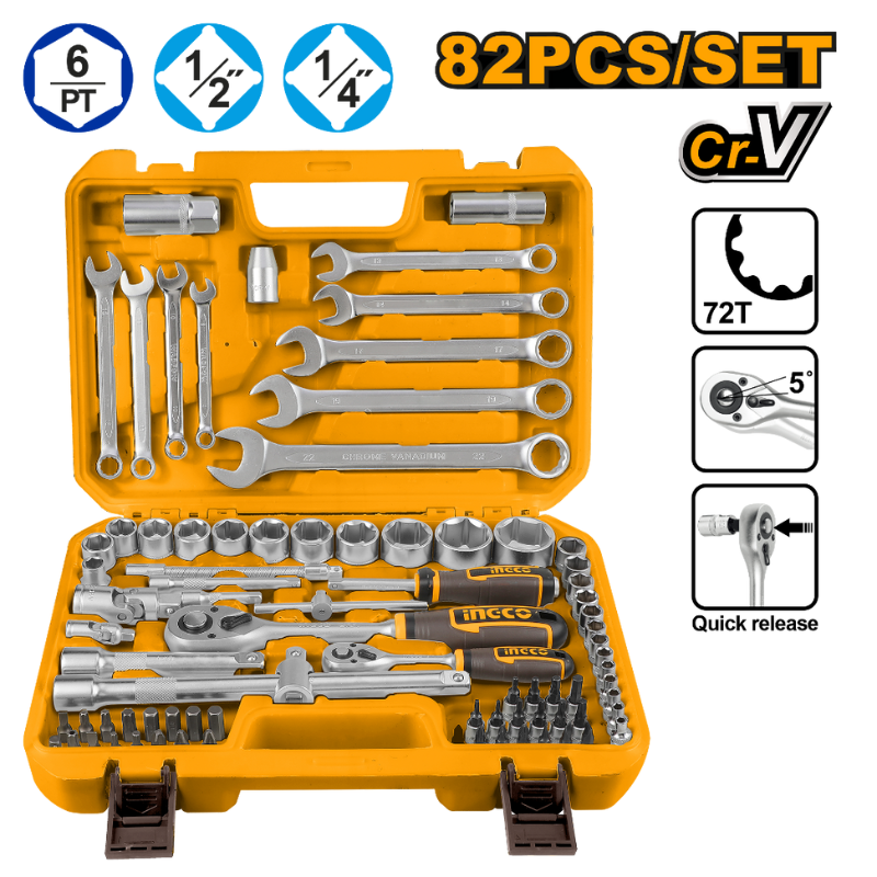 Set complet de 82 de piese, ideal pentru diverse aplicații mecanice și reparații, oferind versatilitate și acces rapid la toate dimensiunile uzuale de chei și tubulare.